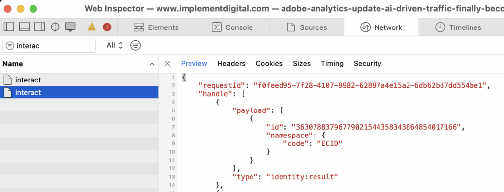 Home » Column » Adobe Experience Cloud » Mac SafariのDeveloper ToolでAdobe Analyticsの計測確認を行う Oct 24 2025 Off Mac SafariのDeveloper ToolでAdobe Analyticsの計測確認を行う はじめに Mac SafariにもDeveloper Toolがありますが、Chromeに比べると少々使い勝手が違うため戸惑うことがあるかと思います。ただ、簡単な計測確認であればいくつか要領を抑えるとできますので、本記事でとりあげたいと思います。 なお、以降の内容は、Mac Safari DeveloperでiPhone Safariを接続できるとiPhone Safariの計測確認にも利用できたりします。 計測確認はNetworkタブから行う ChromeのDeveloper Toolと同じ名前のためあまり戸惑わないとは思います。Networkタブをクリックするとページで発生したHTTPリクエストが閲覧できます。ここで/b/ss/やトラッキングサーバでフィルタするとAdobe Analyticsの計測リクエストを絞り込むことができます。参考:https://experienceleague.adobe.com/ja/docs/analytics-learn/tutorials/implementation/implementation-basics/how-to-identify-your-analytics-tracking-server-and-report-suites データの確認はHeadersタブを利用する 確認対象のHTTPリクエストをクリックし、HeadersタブのQuery String ParametersあるいはRequest Dataで送信データを確認することができます。●余談POSTデータによっては、Request Dataセクションが以下のような表示になることがあります。赤枠のアイコンをクリックするとPOSTデータの詳細をPreviewタブで表示できます。以下の画像はWeb SDKの例となります。 Preserve Logもできる クリック計測の確認など、ページ遷移前後のHTTPリクエストも消えないようにしたい場合はPreserve LogをONにします。 Mac Safariだとフィルタテキストの入力欄右横にボタンがあります。これをクリックするとPreserve Logを選択できます。Preserve LogをクリックするとチェックONとなりボタンも少し青く表示されるようになります。 おわりに ちょっとした確認だとプロキシツールを使わずともSafariのDeveloper Toolにて代替えすることができます。iPhone Safariでも活用できますので、アドオンやプロキシツールが利用できないようなケースに活用いただければと思います。 備考:AAの計測リクエストのパラメータ説明 Experienceリーグのページで紹介されていますのでこちらも合わせて確認してくださいhttps://experienceleague.adobe.com/ja/docs/analytics/implementation/validate/query-parameters Implement DigitalではAdobe Launchの導入、運用を支援するサービスを提供しています。ご興味がありましたらお問い合わせください。 この記事をシェアする : Post navigation Previous PostPrevious Adobe Web SDK移行に伴う Adobe Analytics 処理ルール実装の変更点