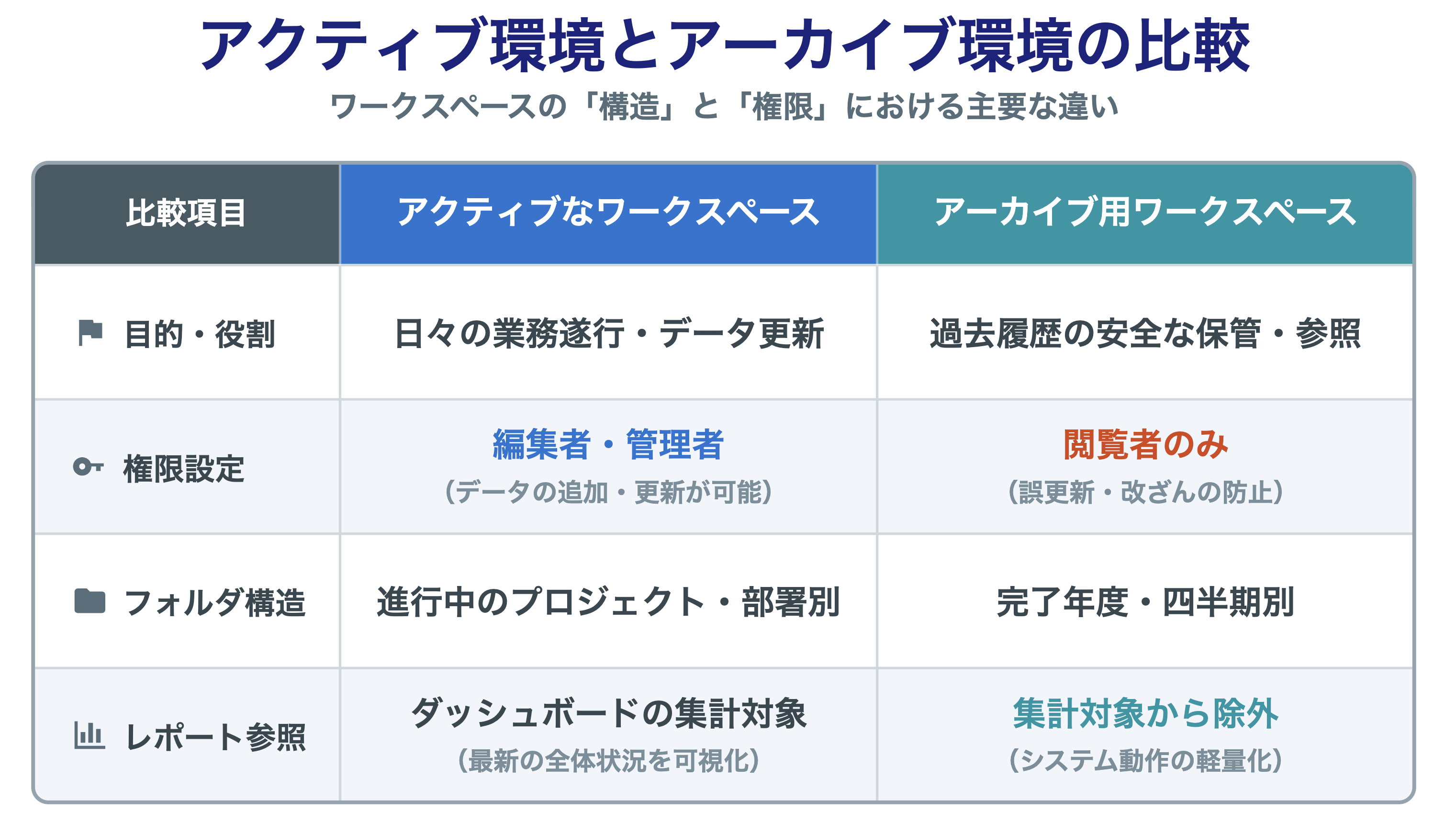 - アーカイブ用ワークスペースへの移行: 完了したシートは、作業用のワークスペースから「アーカイブ専用ワークスペース」へ移動させます。この際、一般メンバーの権限を「閲覧者」に変更し、誤ってデータが書き換えられるのを防ぎます。